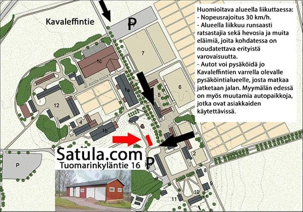 • Autojen pysäköinti: Autoja voi tarvittaessa pysäköidä jo Kavaleffintien varrella olevalle pysäköintialueelle, josta matkaa jatketaan jalan. Myymälän edessä on myös muutamia pysäköintipaikkoja, jotka ovat asiakkaiden käytössä